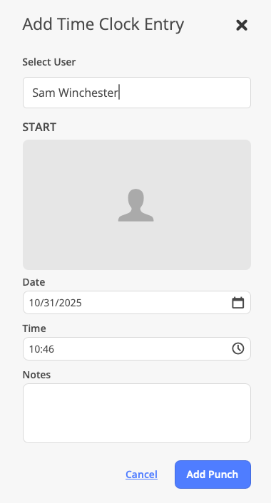 Why - This feature was developed due to customer request to provide administrators with the ability to create time punches for users who forget to clock in, ensuring proper shift tracking and allowing personnel to clock out normally at the end of their shift.