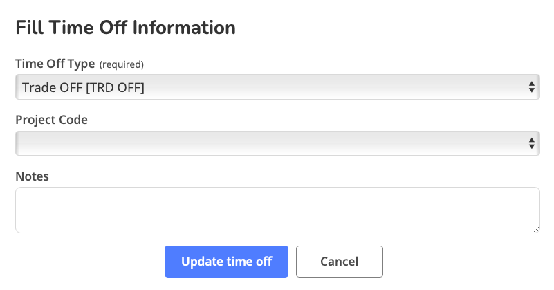 • What - Administrators can now edit trade-related time off entries after approval using the same editing capabilities available for standard time off entries, including modifications to time off type, subtype, and project codes as business needs require.