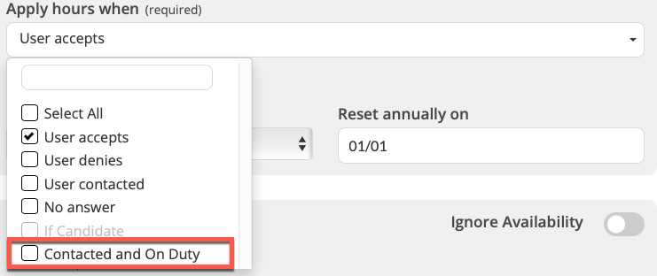 • What - A new "Contacted and On Duty" option has been added to call shift rules that provides granular control over when users are charged for call shifts, ensuring users are only charged when they are both contacted for a call shift AND currently on duty at the exact time the shift starts.