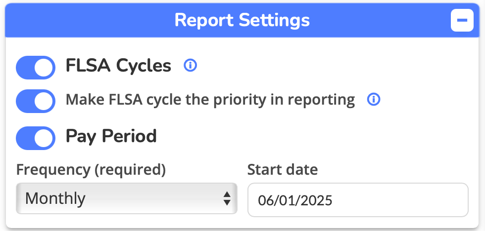 Q: How do I know if I should enable FLSA cycle priority? A: Enable this if your primary reporting need is FLSA compliance and overtime tracking. Leave it disabled if you frequently need reports based on calendar months or custom date ranges. You can toggle this setting without affecting your underlying cycle configuration.
