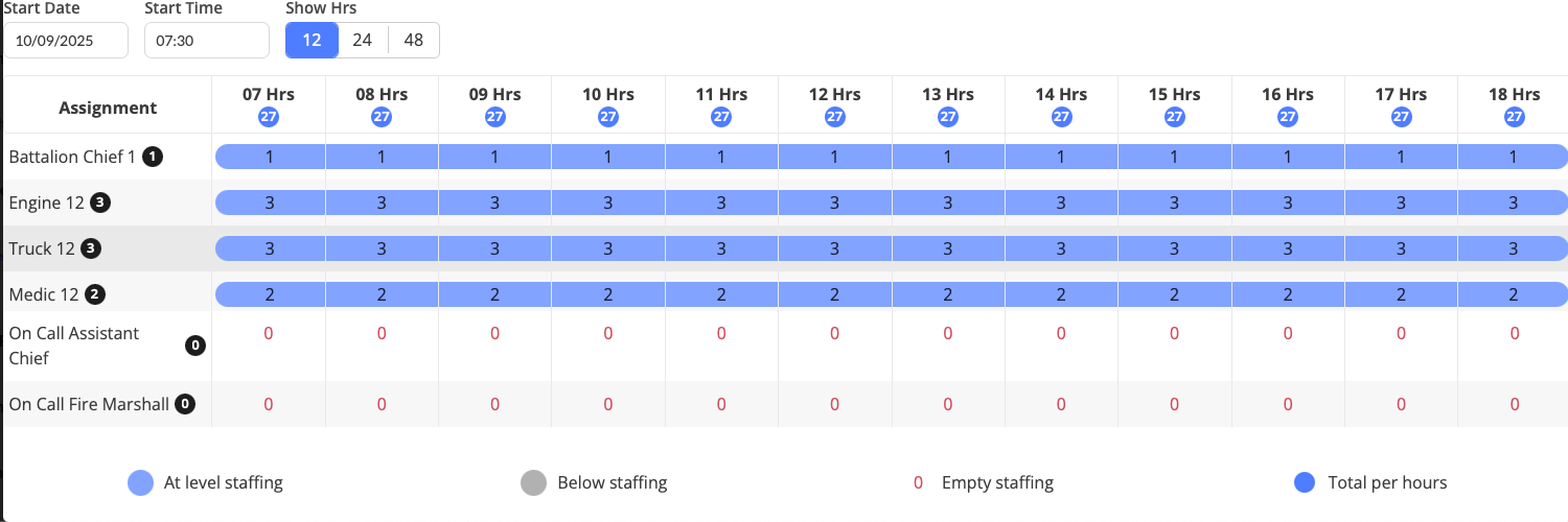 Q: The staffing numbers don't match what I expected. How do I troubleshoot? A: Verify the following: (1) Time range you're viewing matches your intended period, (2) All assignments are configured with correct staffing level targets, (3) Shift schedules have been properly published, (4) Personnel assignments are correctly mapped to apparatus/stations.