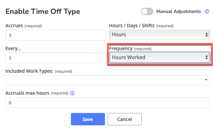Time Unit: Choose between Hours, Days, or Shifts to define how the accrual is measured