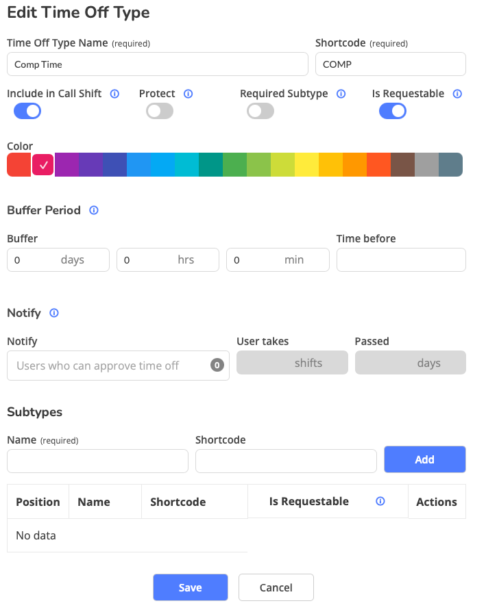 Subtypes (optional): Add any subcategories of compensatory time if your department tracks different types separately