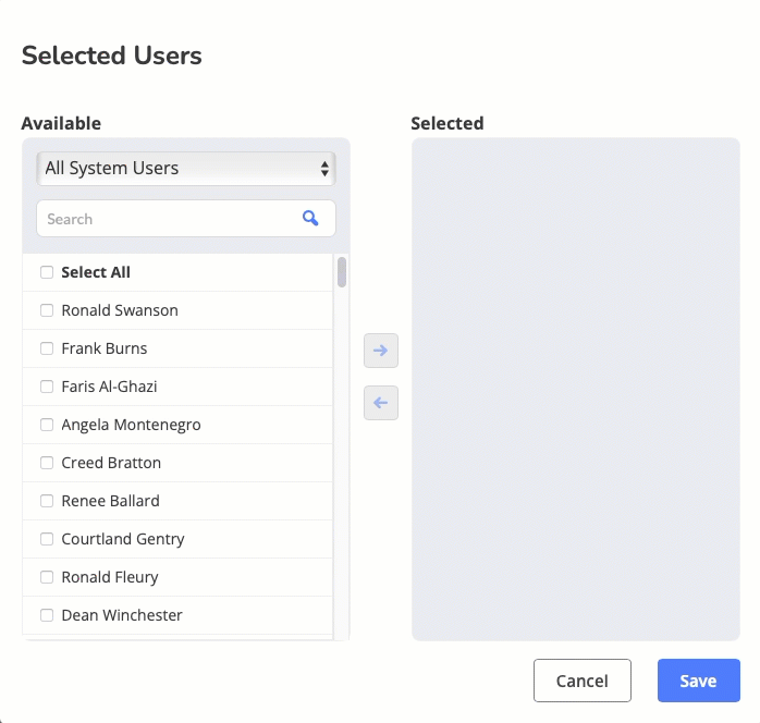 To remove personnel from the group, select them in the right-side list and click the left arrow button.