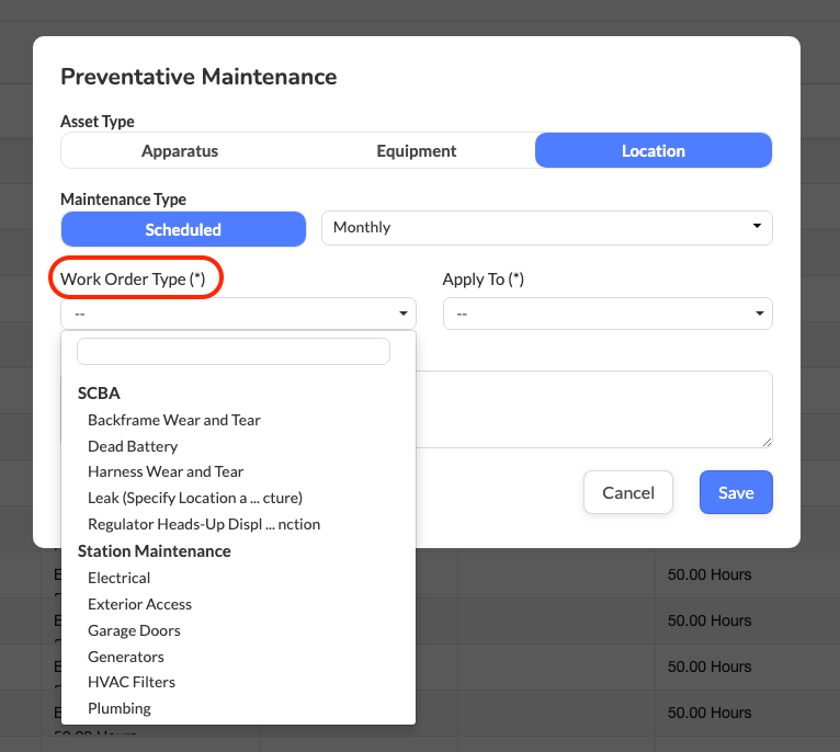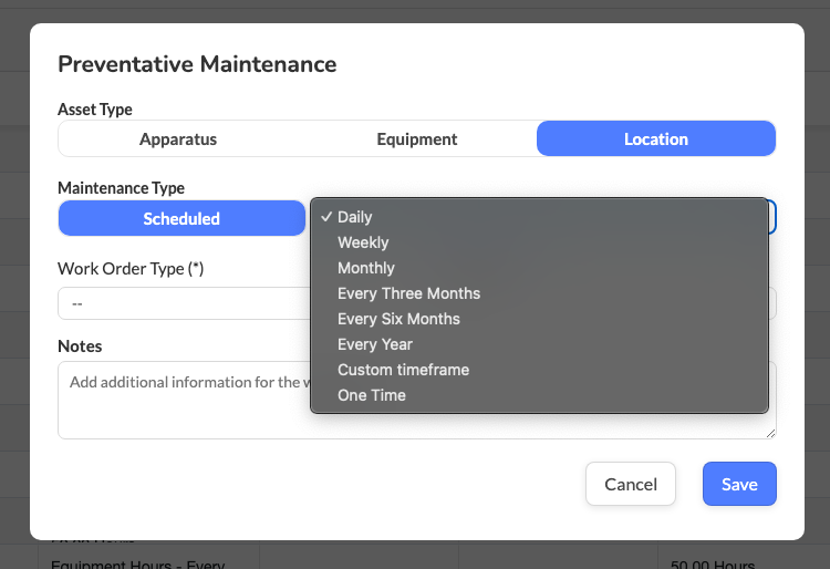 The purpose of this article is to demonstrate how to set up Preventative Maintenance (PM) for Locations. Preventative Maintenance automates recurring work orders to support station and facility upkeep using time-based and/or trigger-based schedules.