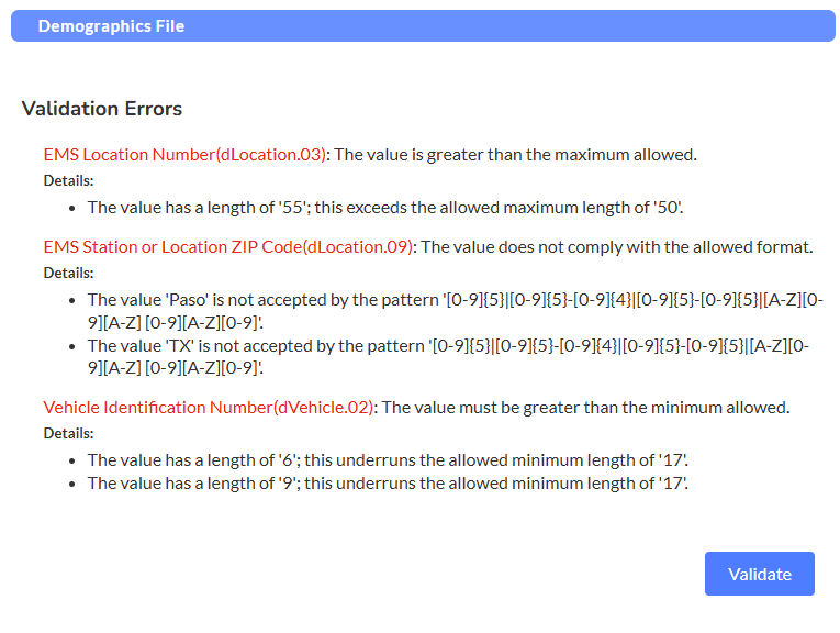 This feature ensures your Demographics dataset meets NEMSIS standards before export submission.