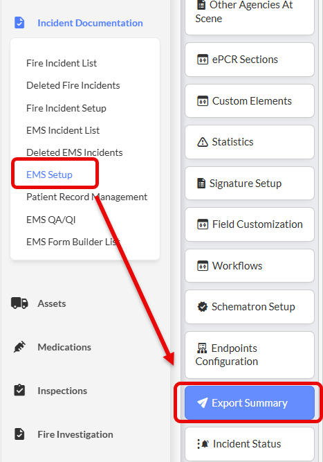 Welcome to the First Due ePCR setup process. Navigate to Incident Documentation > EMS Setup to access the Export Summary configuration section.