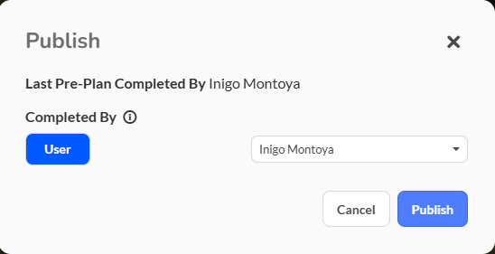 10. If enabled by your Pre-Plan Administrator, after selecting Publish a Validation Modal will appear. This allows for the Pre-Plan to be a credited to a specific user. This can be used when a Pre-Plan is completed using a Unit login but needs to be credit to a specific user.