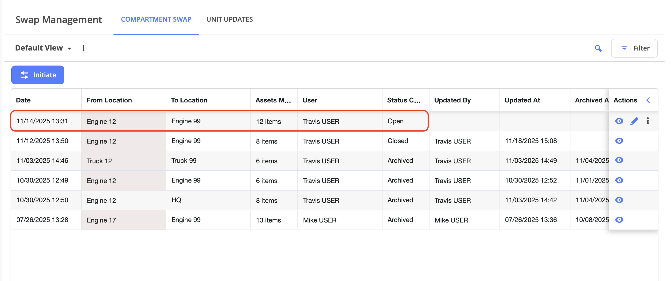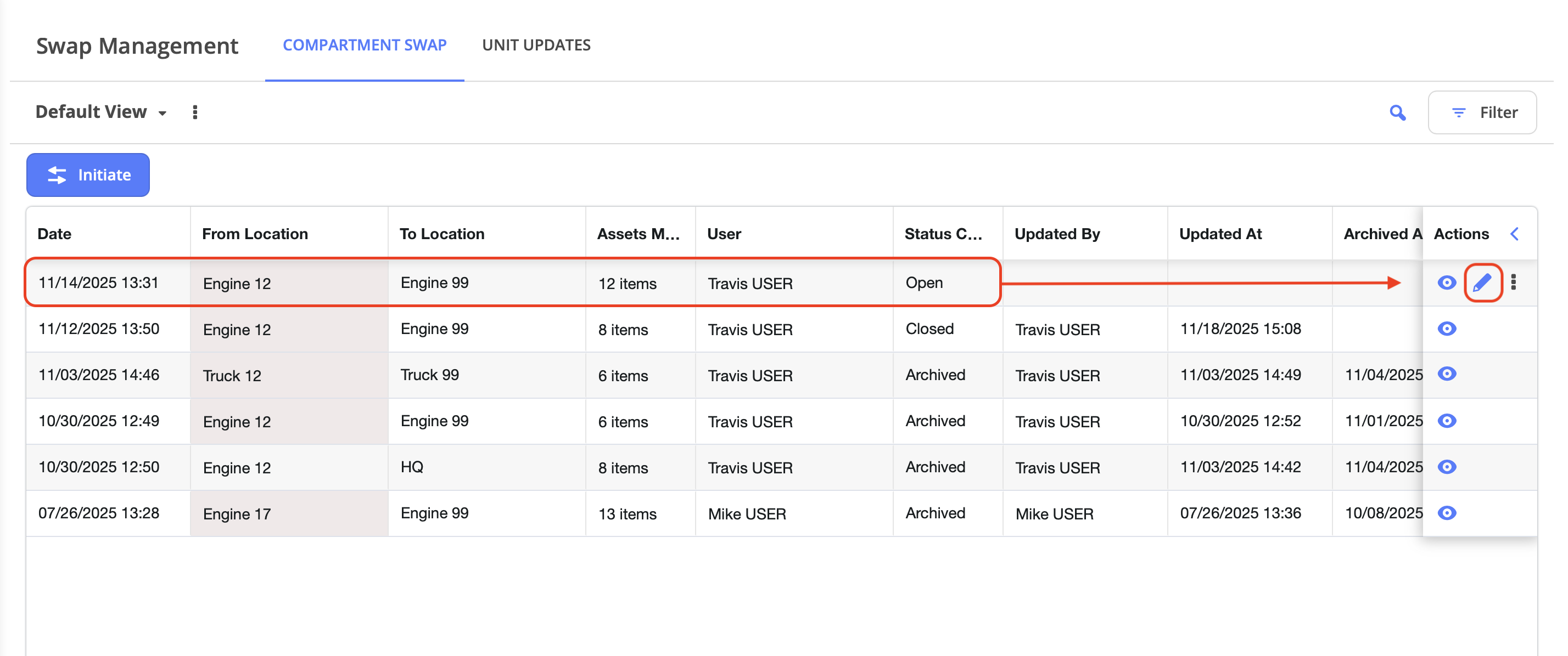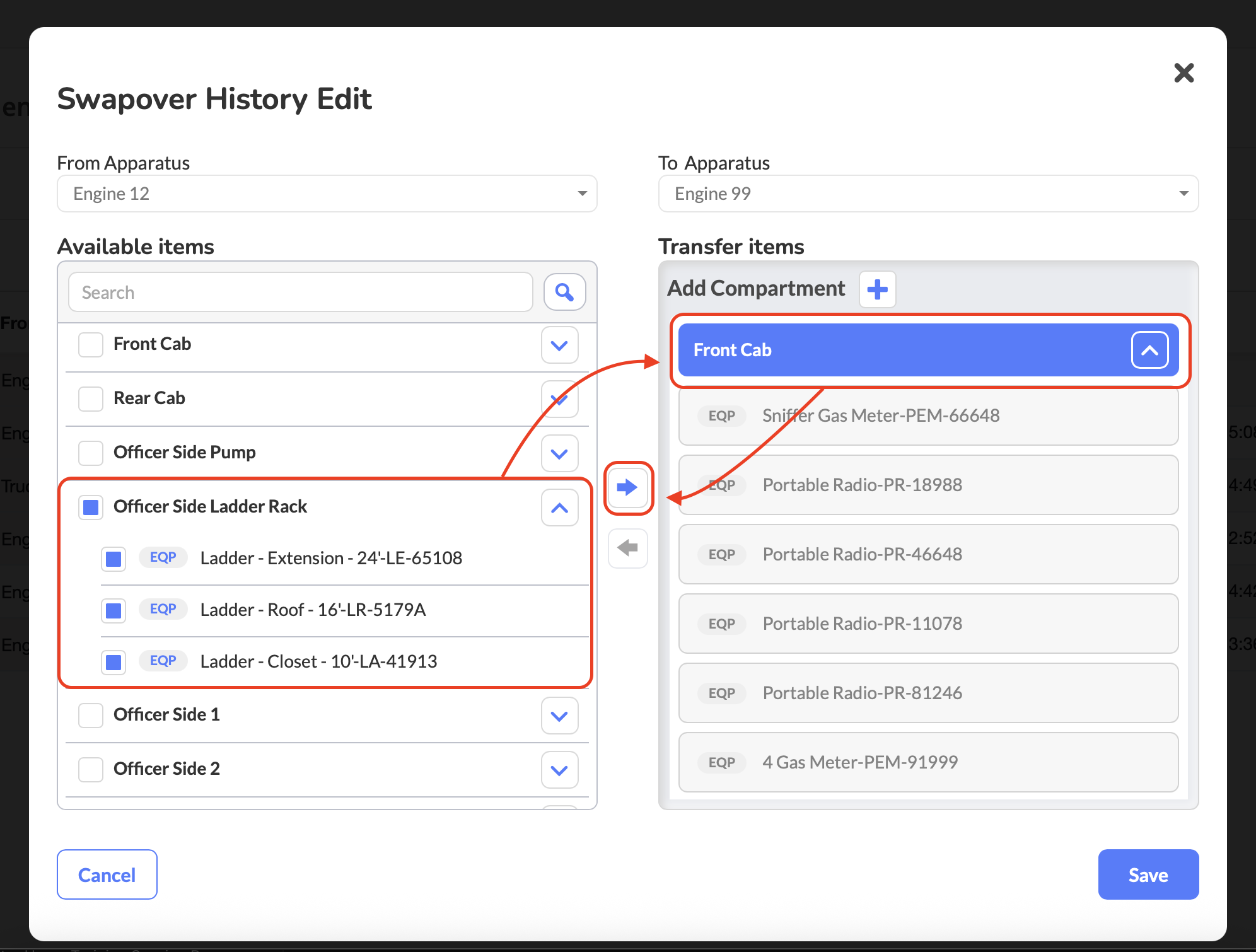During apparatus swap operations, situations may arise where additional equipment, inventory, or kits need to be transferred, items need to be removed from the swap, or compartment assignments need to be adjusted. The ability to edit open swaps allows departments to maintain accurate real-time equipment, inventory, and kit tracking without having to cancel and restart the entire swap process.