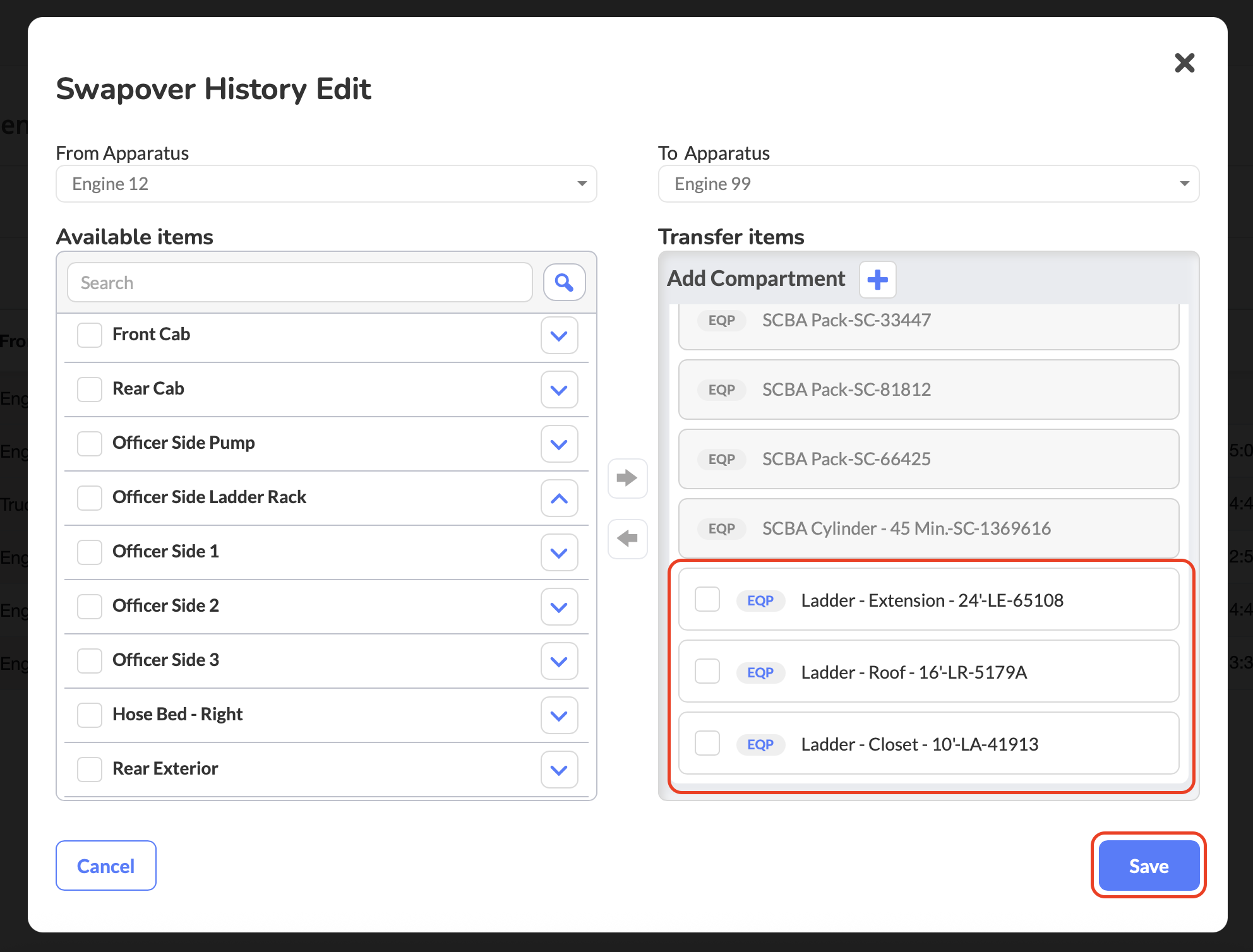 Important Note: Unless adding a new compartment, only the compartments that equipment, inventory, or kits were transferred to in the initial swap will be available to accept additional items.Verify that the asset types were moved successfully. Click on Save to apply your edits to the open swap.