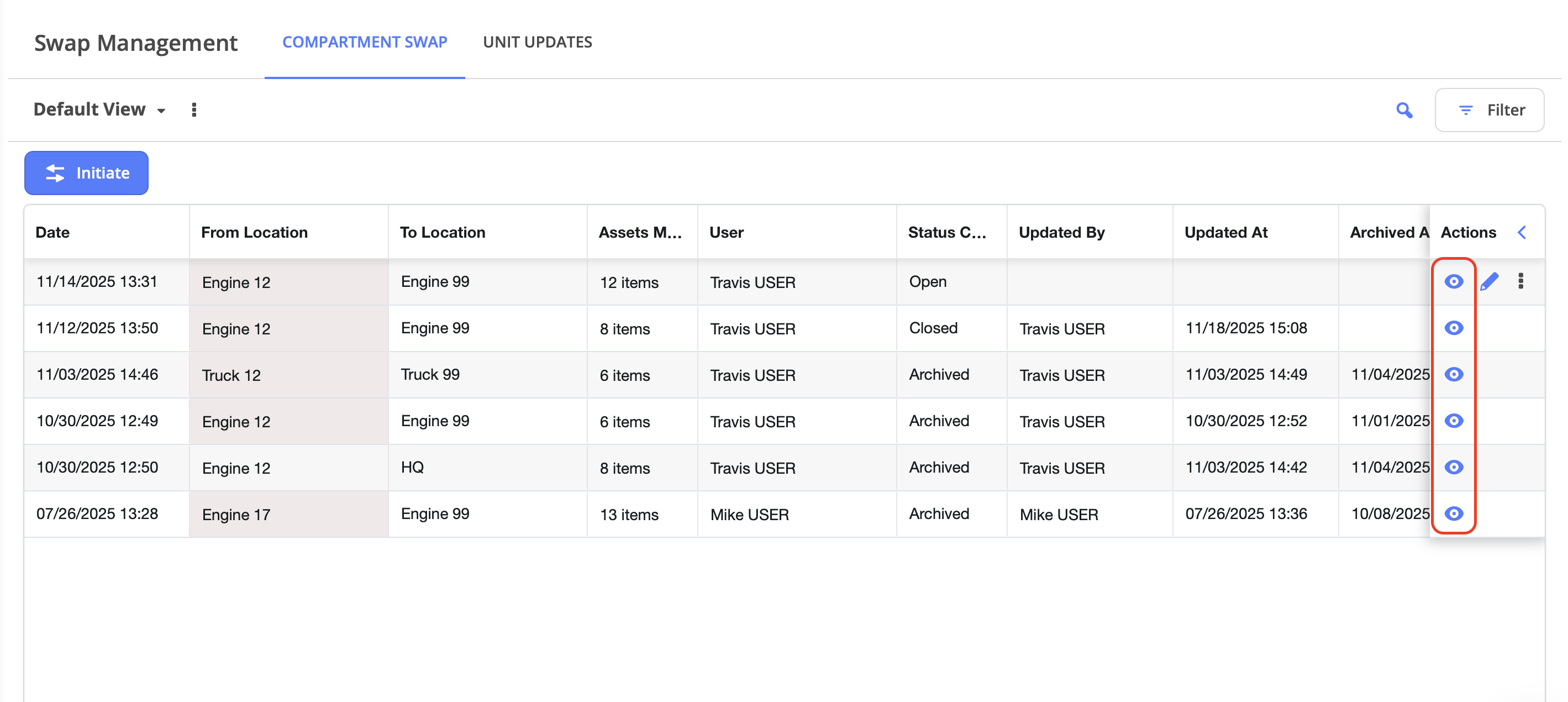 A: Make sure you're clicking the View icon (eye icon) to open the full swap details. Once inside the detail view, you need to expand individual compartments by clicking on them to see the item-level details for equipment, inventory, and kits.