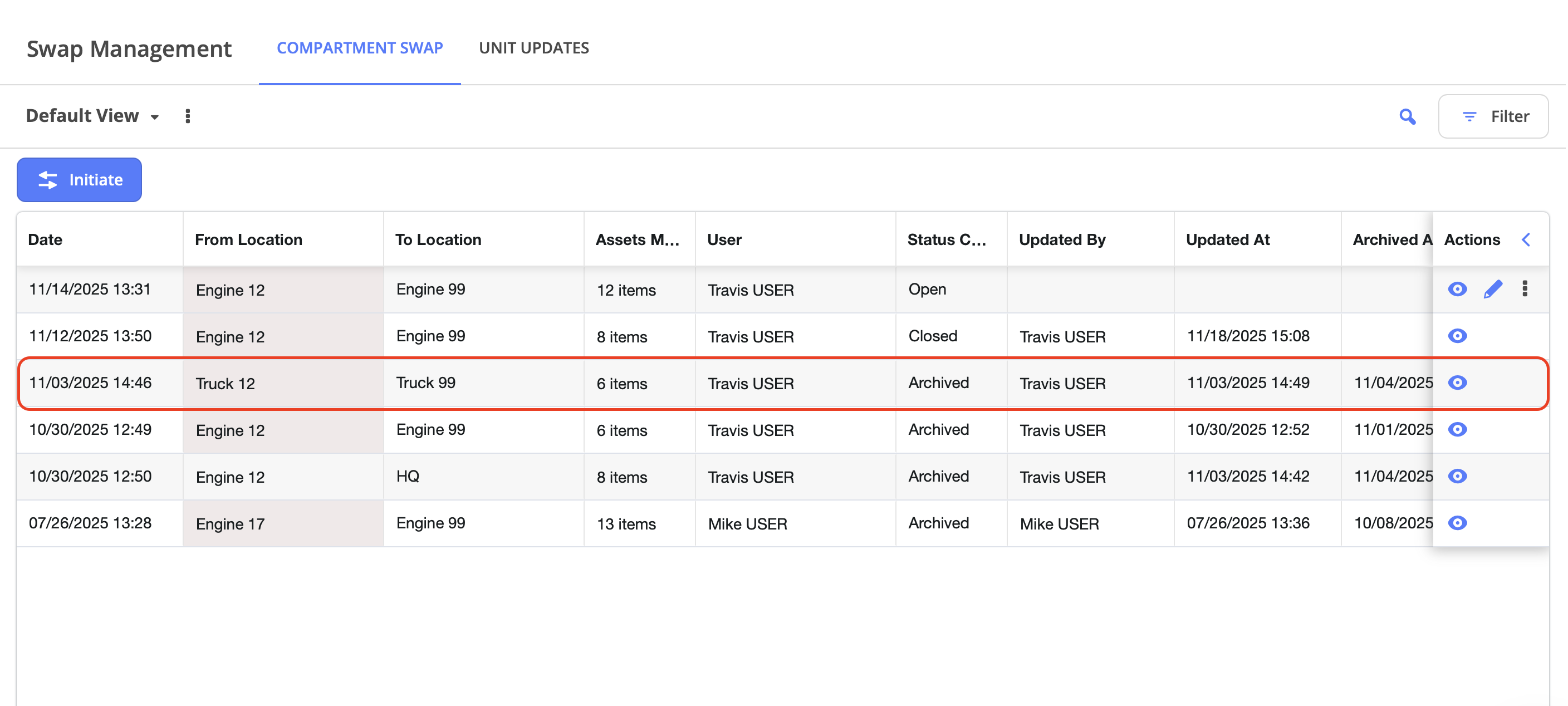 This article demonstrates how to access and review historical details from completed or archived apparatus swaps within the Assets module. This functionality allows users with appropriate permissions to audit equipment, inventory, and kit movements, verify swap completion, and maintain accountability for asset transfers between apparatus. Viewing swap history is essential for quality assurance, compliance documentation, and resolving discrepancies in equipment, inventory, and kit accountability.