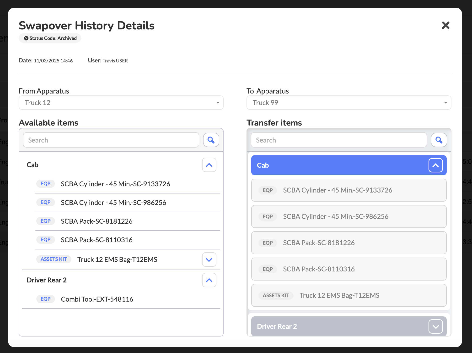Apparatus swaps occur when equipment, inventory, and kits need to be transferred between vehicles, typically when an apparatus is placed out of service for maintenance, repair, or replacement. Once a swap is completed or archived, the transaction details are stored in the Swap History log. This historical record maintains a complete audit trail of all equipment, inventory, and kit movements, including which items were transferred, which compartments were involved, and when the swap occurred.