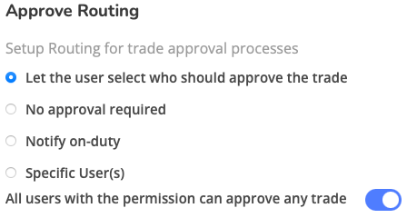 All Users with the permission can approve any trade- Allows any administrator to approve trades, even if it wasn't sent to them for approval
