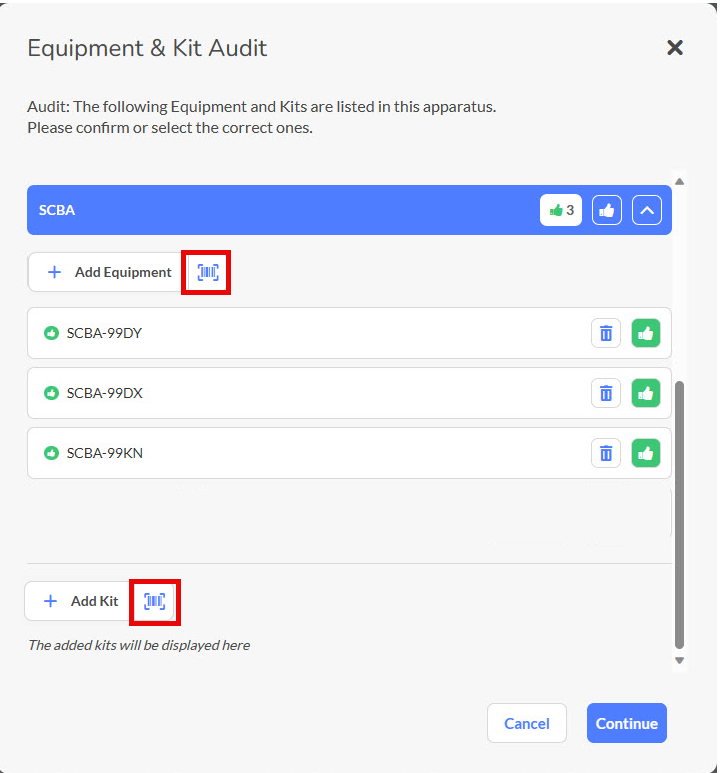 Selecting the barcode will open the device's camera and allow users to scan the barcode to add the item so long as your agency has scanned and uploaded the barcode as the Equipment or Kit ID.