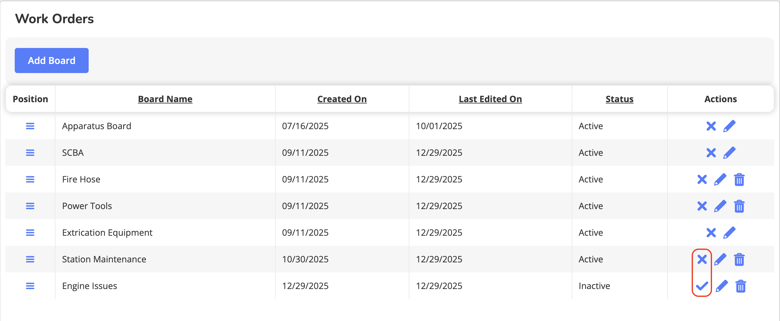 To deactivate a work order board, click the Deactivate icon next to the board. To make the board available again, click the Activate icon.
