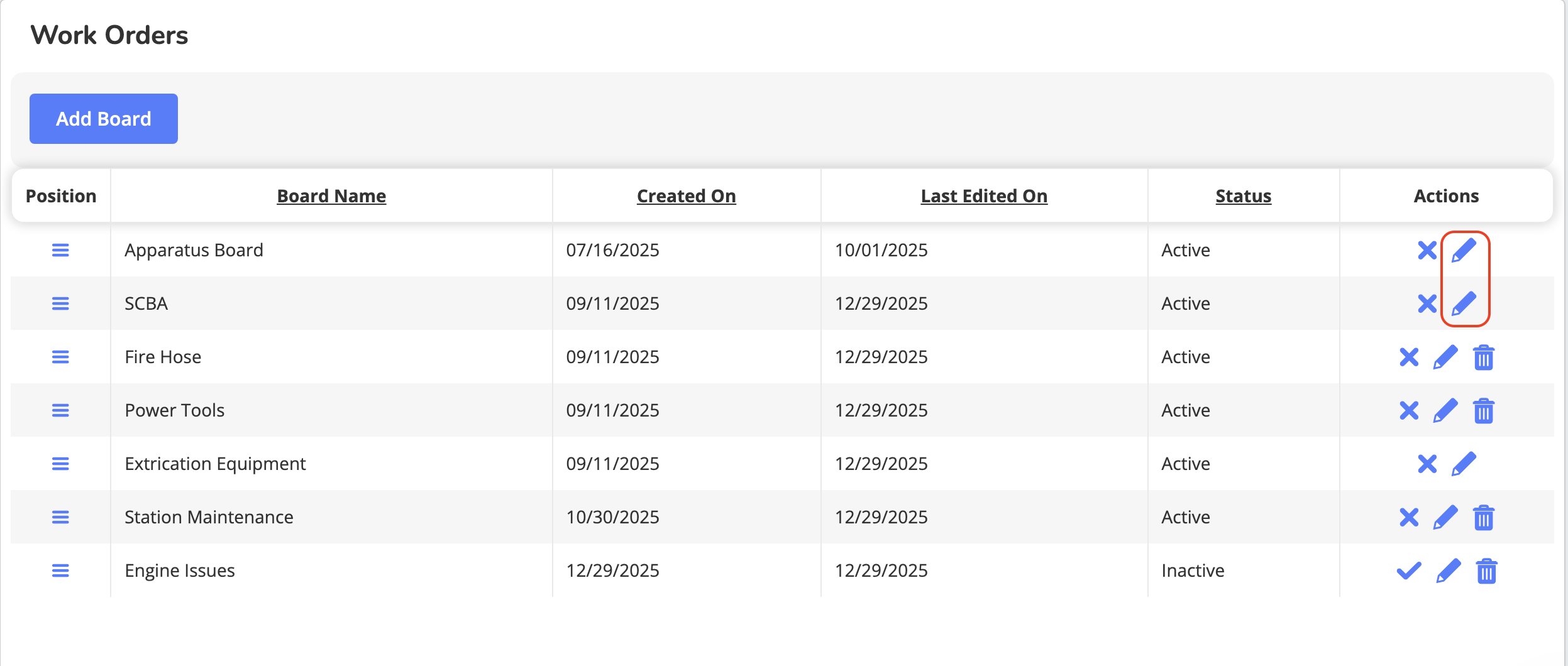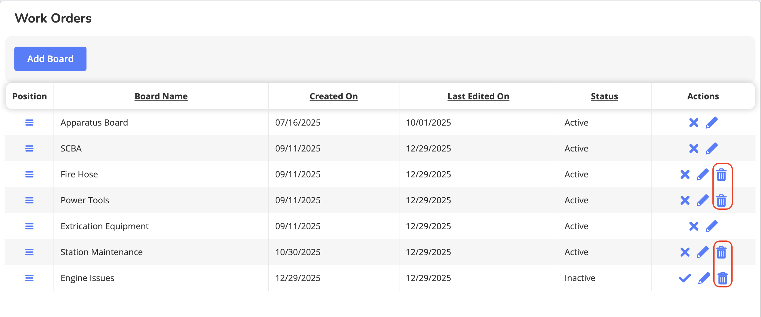 Work Order Boards are created during the initial setup of the Assets module and are used to organize and track maintenance activities. Over time, agencies may need to adjust board order, temporarily disable a board, update its configuration, or remove boards that are no longer needed. Managing existing boards ensures the Assets module remains accurate, streamlined, and aligned with current operational needs.