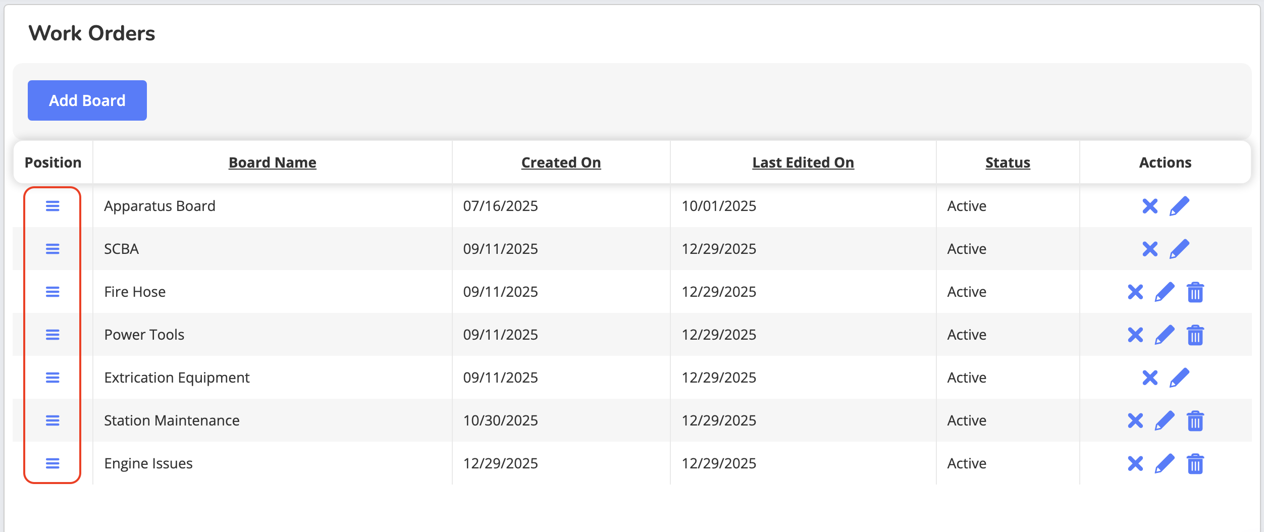 To change the order of work order boards, click and hold the position (drag) icon next to a board and move it to the desired location in the list.