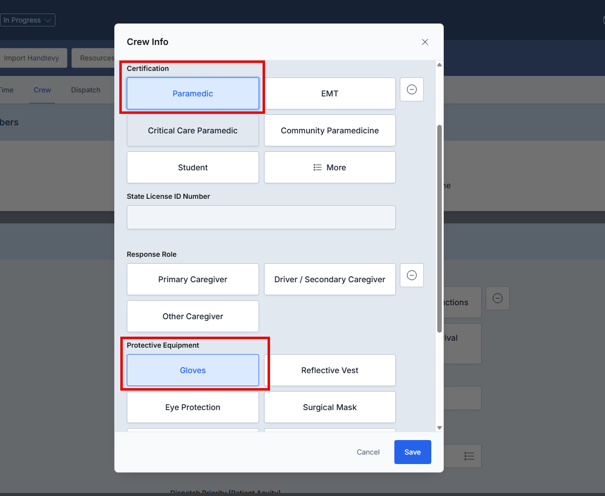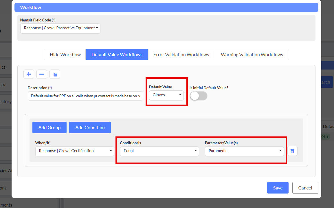 Scenario: Default "Gloves" for when response crew certification is equal to Paramedic.