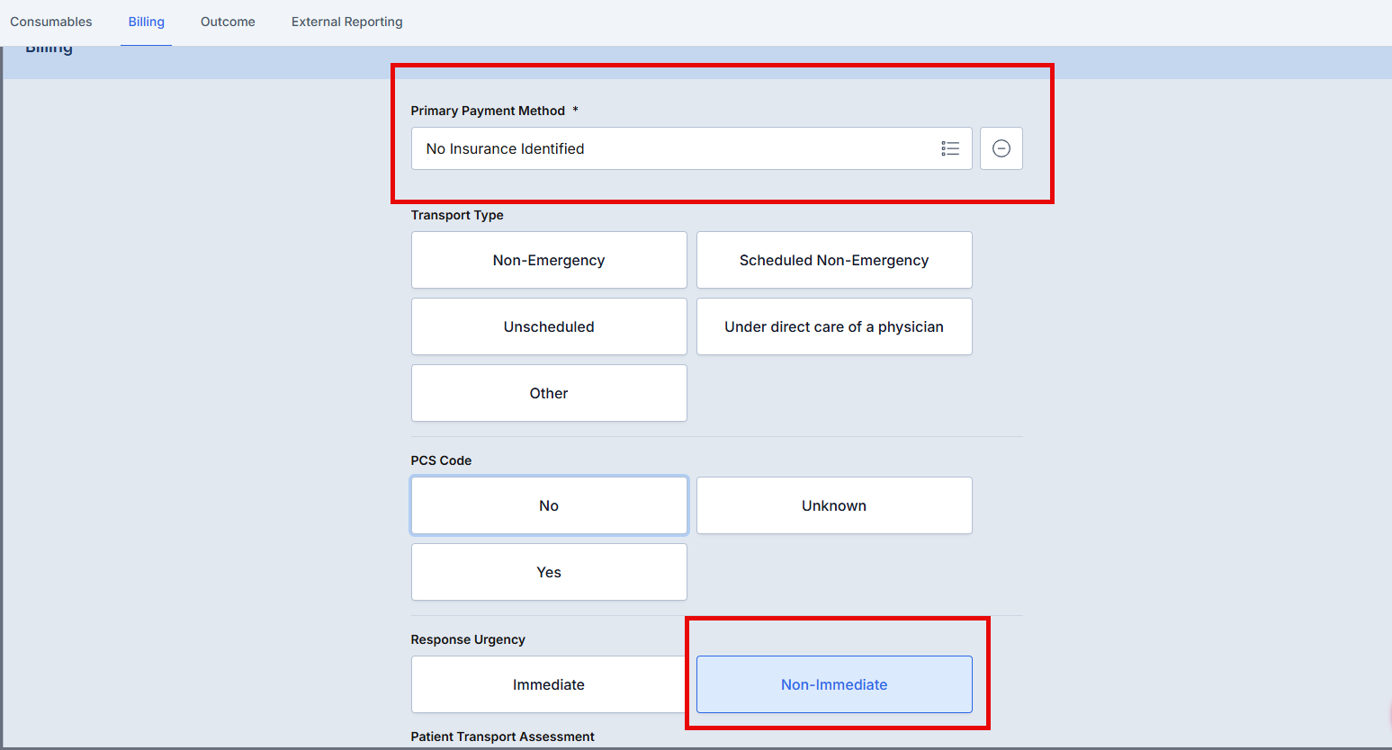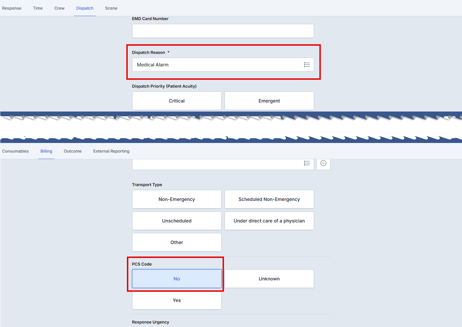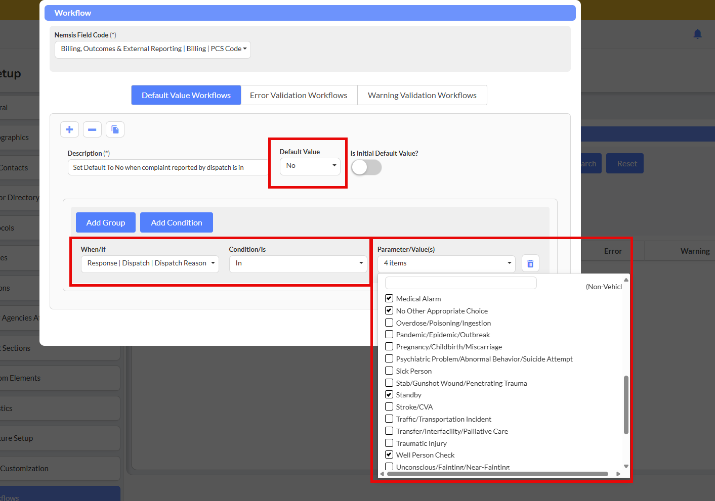Scenario: Default "PCS Code" to "No" for 4 different possible non-transport dispatch reasons.