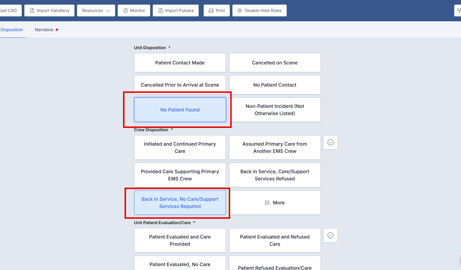 Scenario: Default "Back in Service, No Care/Support Services Required" for calls when Unit Disposition is Not Equal to Patient Contact Made.