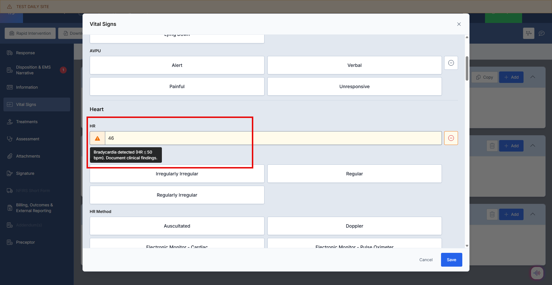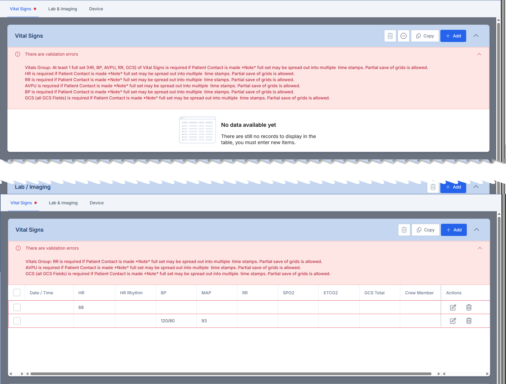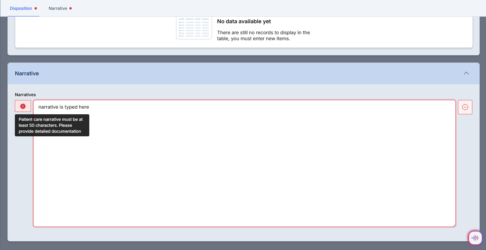 - Error Message: "Narrative must be at least 50 characters. Please provide detailed patient care description."