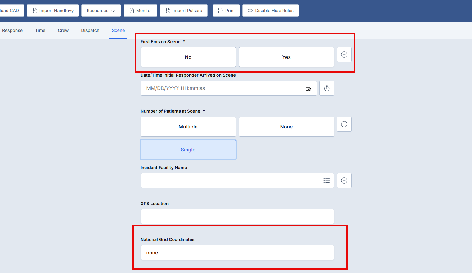 Scenario: Default "National Grid Coordinates" to "None" when "First EMS on Scene" field is empty.