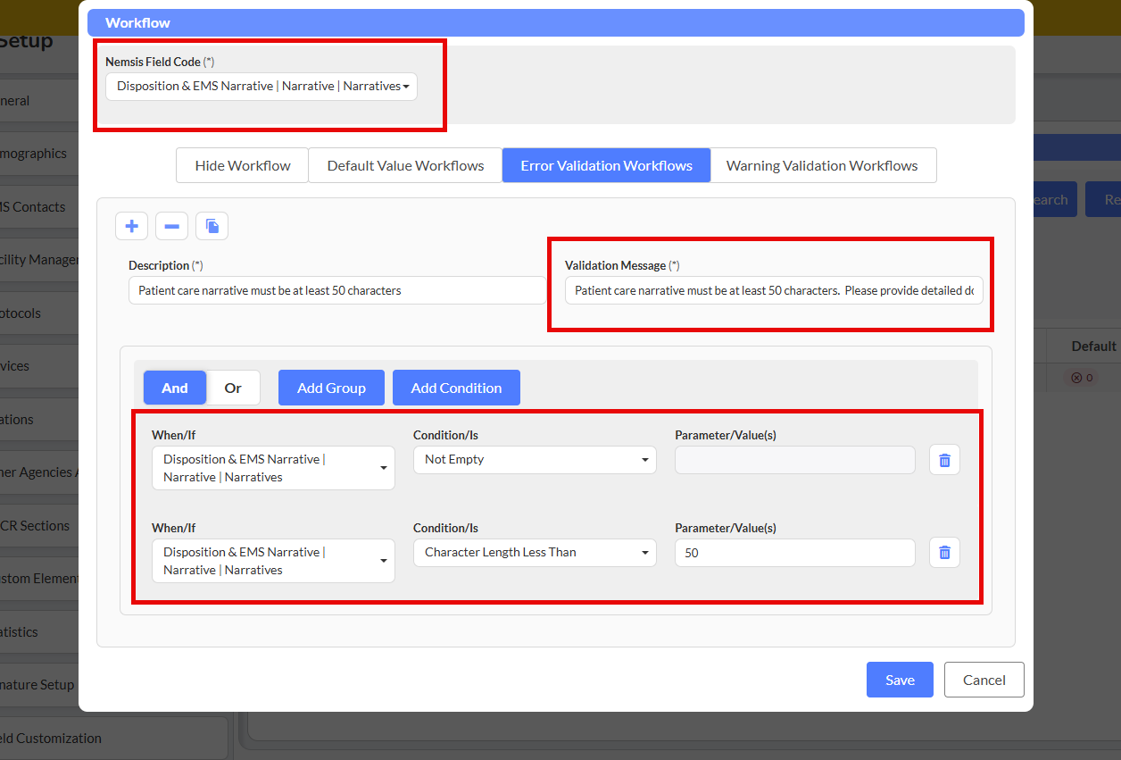 Scenario: Require patient care narratives to be at least 50 characters to ensure adequate documentation.